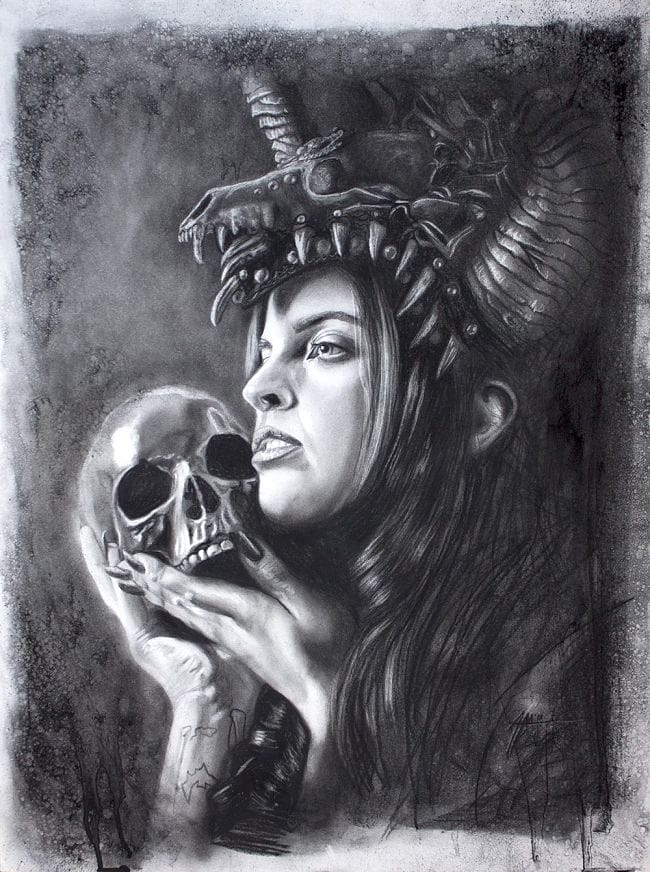 DAE Press // Powerful, and Beautiful Femme Fatales are the muse that drives Adam’s work. Rendered in a painterly realism using both oils and charcoal, we are drawn in to lustful admiration for these stunning women. Whether covered in ink or dripping in blood, each is a devotional act.