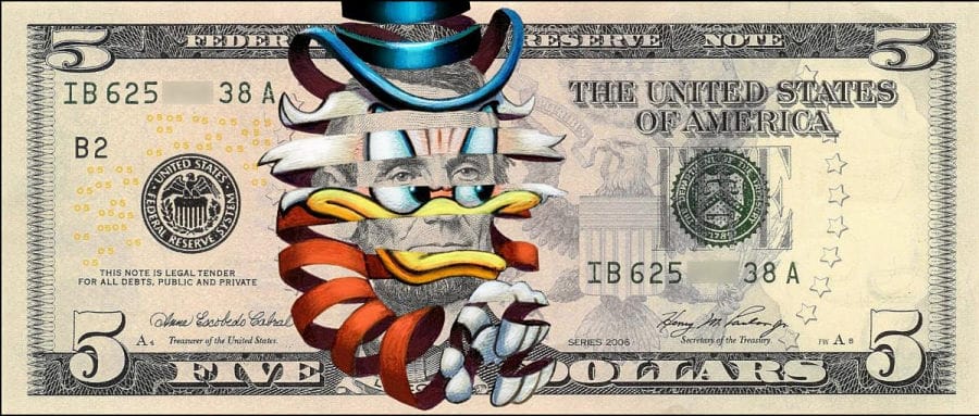 SUPER A Scrooge McDuck. Digital DTG print on U.S. Five Dollar Bill Edition of 506.1 x 2.6 inches / 15 x 7 cm. Signed and Numbered on the back by the artist. This special edition will be available on Friday, January 15 at 9am Los Angeles / 12:00pm NYC / 5pm London / 6pm Berlin / 1am (Dec. 12) Hong Kong in the Thinkspace Project’s web shop.