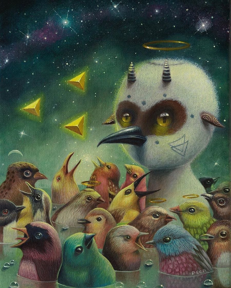 All the beings that I paint are awake beings, connected to the universal movement they ignore our rules and have the mission to challenge the viewer, to make him see beyond, to push him into the unknown, to shake his world. The beings float, the world’s upside down, the drops rise, the birds fall, the flowers as spirits… I try to break the foundations of our belief system with these elements and to show that there are infinite numbered possibilities.