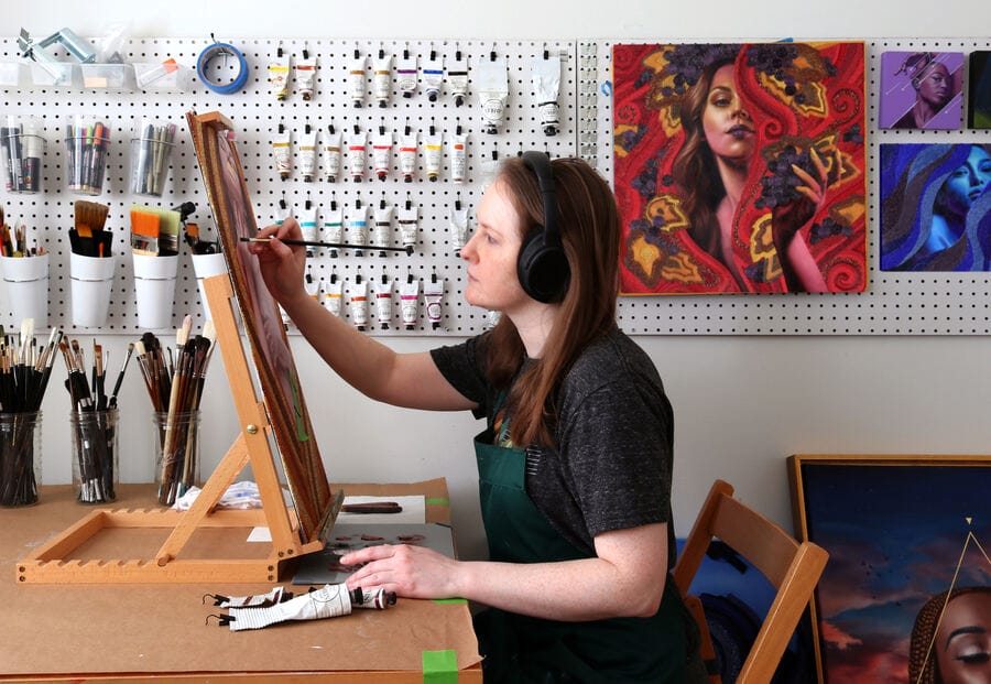 Karen Remsen is a Chicago-based artist creating oil and mixed-media paintings. Her work centers on exploring the multifaceted nature of female power and identity. Combining paint with reflective materials, her work also explores the beauty and complexity of light as it moves over a surface and changes throughout the day. Karen is a self-taught artist who rediscovered painting in 2020 after a hiatus of nearly 15 years. She has exhibited across the country in galleries that champion imaginative realism and contemporary figurative work.