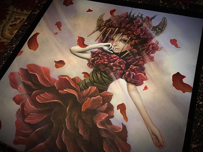 You must be talking about “Memento Mori”, the (darker) Snow White painting. Recently, I’ve been contemplating about the time I have left in my life, and I’ve been creating pieces that relates with that theme. “Shiki soku zeku” means: no thing is tangible, and everything is in a constant flux