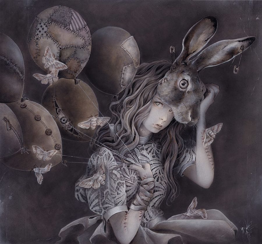 Haven Gallery is pleased to present “Obsessions”, a solo show of paintings by self taught, Mexican illustrator, Yuriko Shirou. “Obsessions” is Shirou’s second solo show at Haven Gallery and will consist of nine paintings encompassing watercolor, acrylic, gouache, ink, marker, pastel and colored pencils. Shirou’s imagery is heavily inspired by the human condition at its darkest moments as well as narrative motifs often found in fairytales. The darker side of these stories are depicted through her own uniquely developed narratives seen through the lens of her emotional states. The artist’s use of contrast and sepia tones strikes an illuminating yet antiqued depiction of her sitters as they subtly pose and engage their telling environments. Her use of a mixed media technique provides depth and conveys a wide range of emotion. These visual explorations embrace challenging psychological states of the mind, such as doubt, mania, agony and unrest, amongst other anxieties, while simultaneously, casting a light on the darkest of moments to show the beauty lurking within.