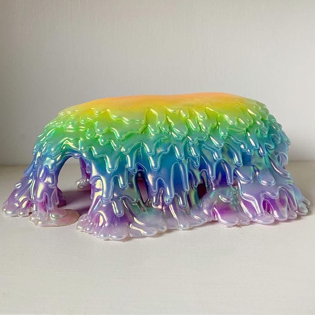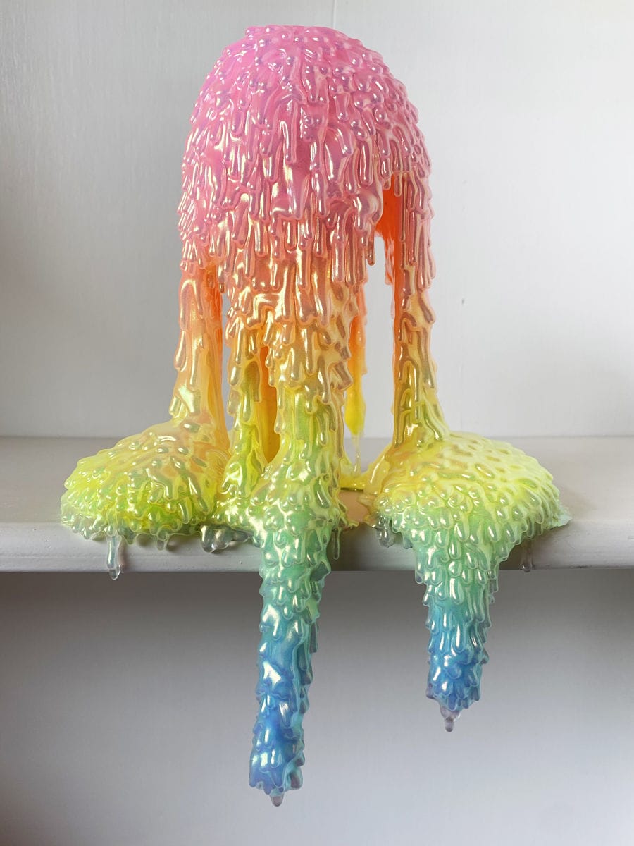 In the past, I’ve done mini versions of my drips, which have been released as individual pieces. With this show, the baby blobs were different in that they composed a larger installation. It’s a lovely idea to think that the collectors who buy a baby blob own something that is part of a larger thing. I think the juxtaposition comes into play with the spike textures and the clustering of the baby blobs (triggering in some people trypophobia) paired with those happy, candy colors. Of course, those feelings don’t happen for everyone and if they’re just beautiful and/or weird objects that’s cool too.