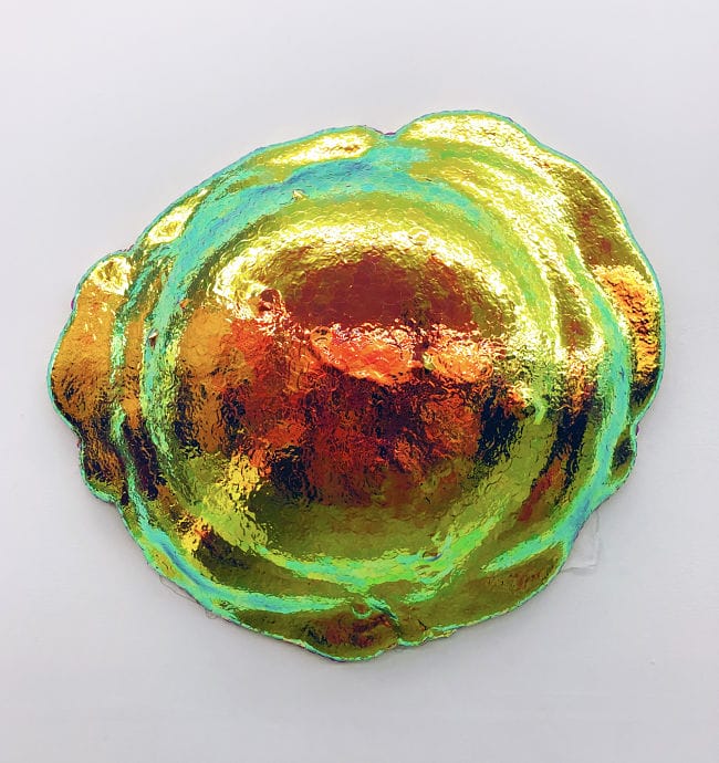 I was super interested in the material, which are black flat back beads treated with a sort of iridescent rainbow film. Beads can have a lot of association, especially with the world of craft. I wanted to push these in a way where you couldn’t immediately recognize what they were. When you see it from a distance you can’t really see the individual iridescence of each bead but it translates in an overall way. I also wanted to explore the textures the beads formed on top of my manipulated polyurethane foam surfaces.