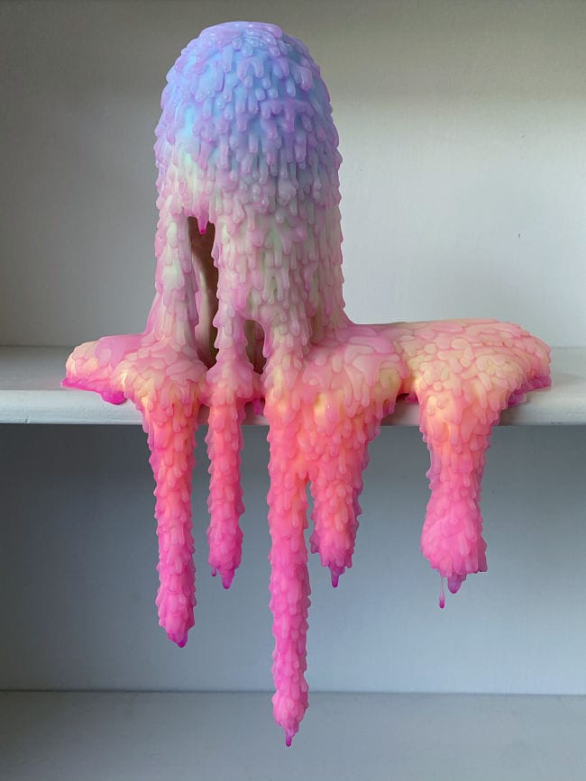 Polyurethane foam is a fun and challenging material to work with. I work with it because I love what it can do, the look it can create, and how it is not completely controllable. The sculptures are dependent on the surface they are made on. For example, with a drip sculpture, I need a pedestal or a 90-degree angle to pour on. The foam is quick and expands in a matter of 30 seconds, so my working time at this stage is short. I can guide where the foam goes and how much of it to pour, producing longer drips or thicker areas. Once that is fully cured, I start the process of layering resins and paints to achieve the look and colors I want. Adding texture is one of the final steps, it’s the most time-intensive and is a nice contrast to the quickness of the foam stage.