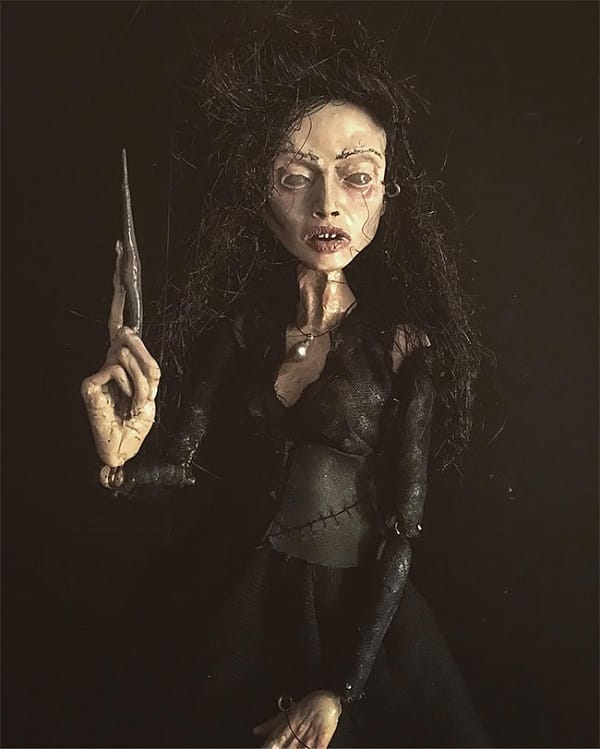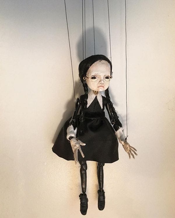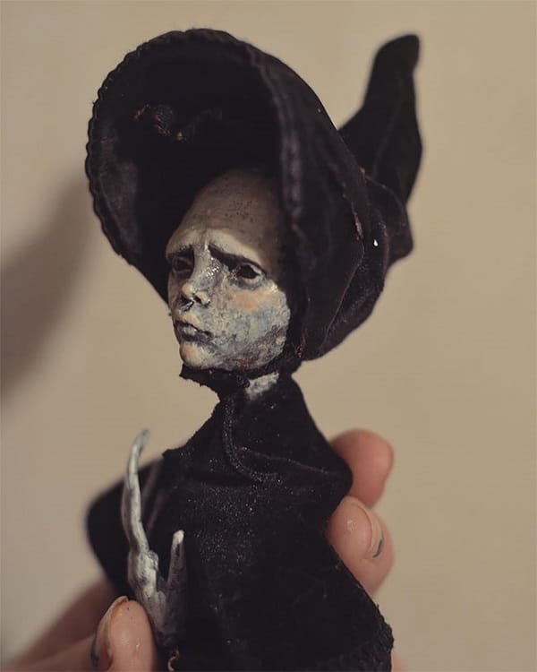 Jewelry, hand-stitched clothing, and tiny tattoos – it’s all in the details with Handsome Devils Puppets. Add to that, elongated, knuckly, wicked fingers and a dry brush skin effect that is positively chalky (like some kind of delicate bone-skin that has lasted eons beyond the grave) and you have a puppet that succeeds at evoking an atmosphere of dark wonder. In the 1999, fantasy-comedy film Being John Malkovich, (which the artist – who prefers to remain anonymous – claims to have seen many years ago while sick in bed) a puppeteer played by John Cusack finds a mysterious portal that leads into Malkovich’s mind. Later on in this highly original script, Cusack and his love interest begin carefully leaking the news about the portal, charging customers two hundred dollars to spend fifteen minutes inside the mind of Malkovich. “I cannot recall any of the film,” the artist said. “It has become a question I’m asked so frequently I guess I’m long overdue for a re-watch!”