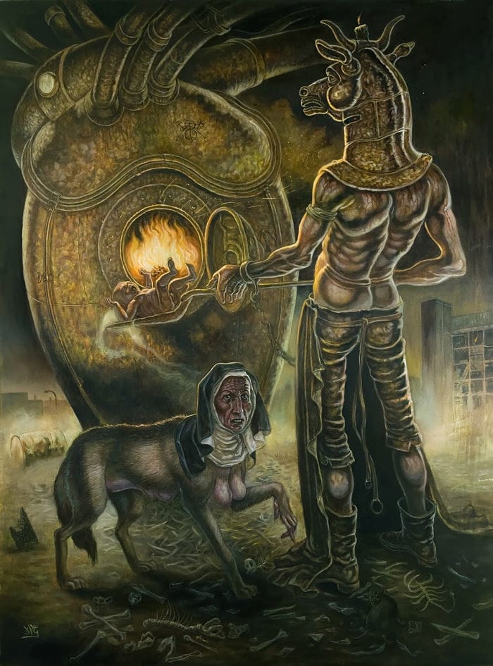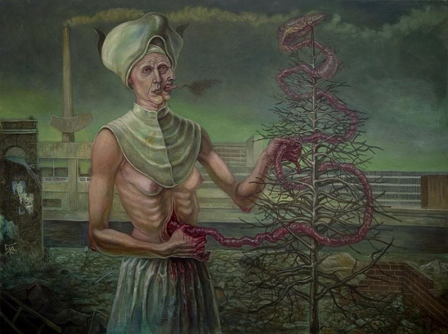 About the Artist // David Van Gough is a Necrosurrealist artist originally from Liverpool, England, living and working in California. A keen scribbler from an early age, his artistic intents were fully realized upon seeing a monograph of Bosch’s Earthly Delights. Enrolling to study at the Liverpool school of Art-upon graduating-he left to work for over a decade as a commercial artist and designer. However, upon the death of a friend–the third to die in a fifteen year period–what he calls a ‘cruel reminder of life’s fleetingness’, revitalized his early artistic ambitions, imbuing his work with “an emotional and spiritual excavation for purpose”