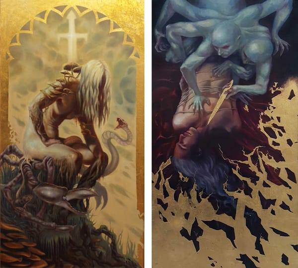(Above) L: “Maldoror”, oil and goldleaf on board, 19.5 x 37.5 inches, 31.75 x 49.75 inches framed