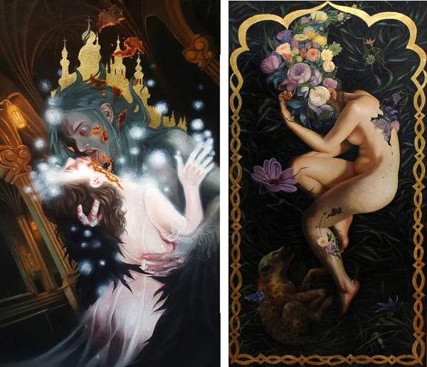 (Above) L: “Angel’s Punishment”, oil and goldleaf on board, 16 x 28 inches, 27.75 x 39.25 inches framed