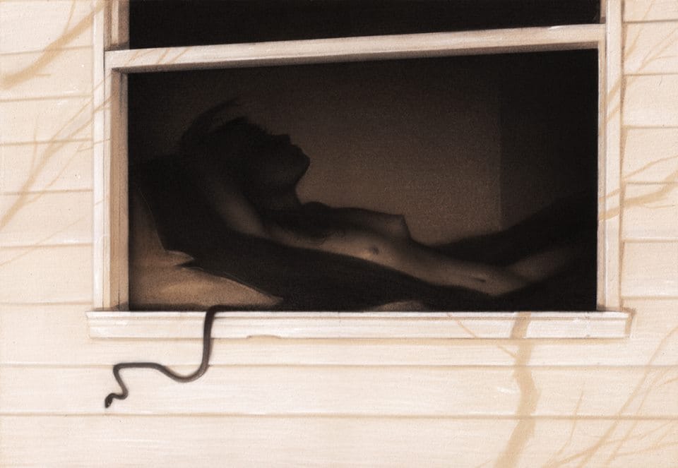 Inside dimly lit American houses, haunting are titillating our senses and emotions, in keeping with old horror movies. Indeed, there is definitely a cinematic vibe in the dark surrealism of the artist, especially in the intimacy between the ominous and the eroticism. The bare bodies are reminding that the artist has previously worked for Playboy Magazine, along other publications. His past job for Magic cards, in the other hand, is orientating us more toward his creative playfulness.