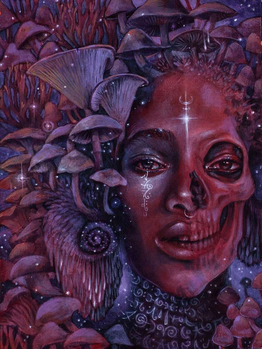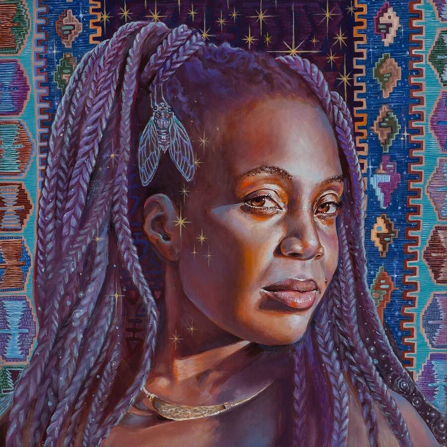 Since then, I have used many friends as models for my paintings, and I try to share a little bit of that ritually-healing and self-reflective experience with each of them. Many of the people I paint have shared their stories with me, and I am always inspired by the ways in which all of our stories weave together. Placing the models in imagery that suggests spaces between worlds has been a fun pursuit, and I feel that gives me the opportunity to create paintings that are both personal and archetypal.