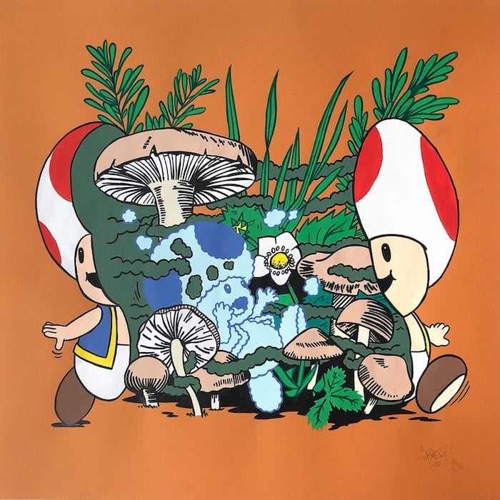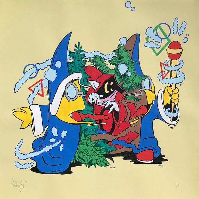 Using familiar characters provides Ermsy with a set of pre-established imaginative boundaries within which to work. Like a hot-boxed descent into an alternate universe of nostalgic psychotropic Saturday morning cartoons, his world is a playful subversion of familiar, pop cultural fodder.