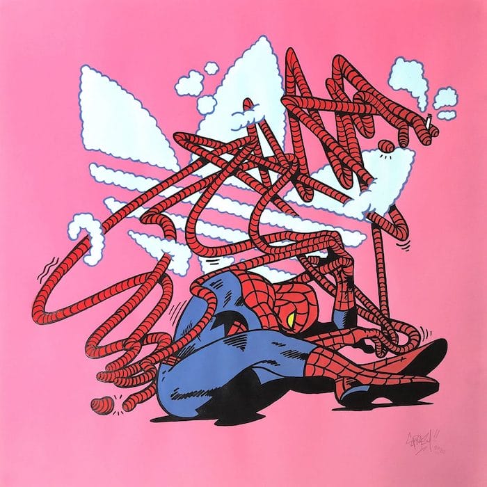 “I love pop culture,” Ermsy explains, “and I love exploring it.” His graphic exploration of pop culture uses popular cartoons in the same way that graffiti writers use letters. “Using well-known characters provides me with a base point, a frame to work within,” he explains. “With graffiti, the idea is to pick some letters from the alphabet, then go crazy with them or do whatever you want. Everybody starts with the same base point, and that’s graffiti. My starting point is to use characters in my artwork.”