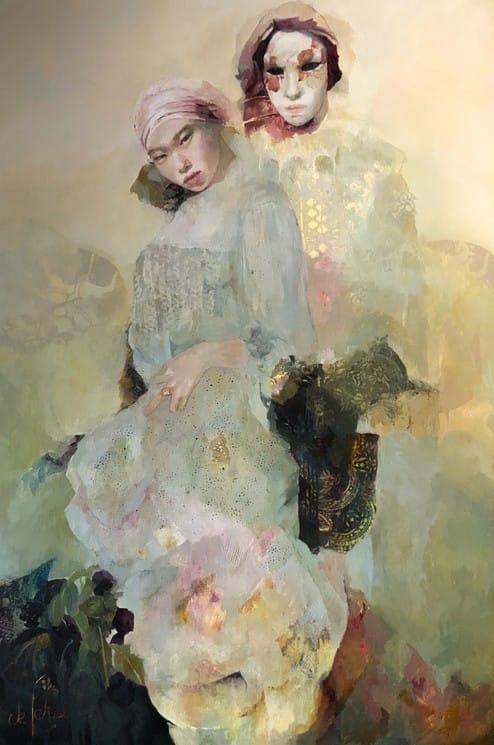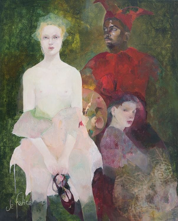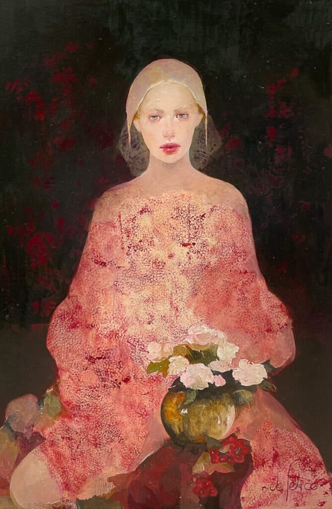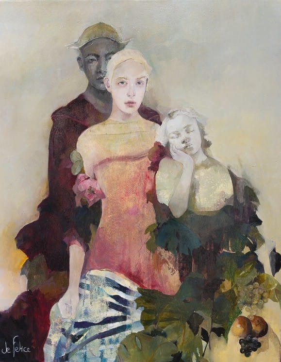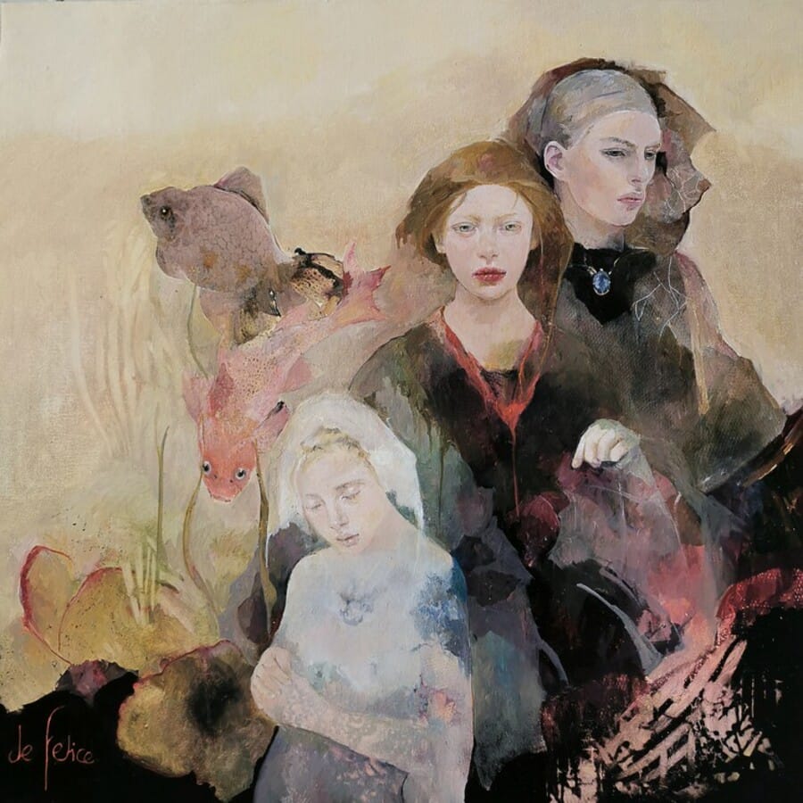 Françoise de Felice is a prolific French painter of Italian descent. She draws portraits of women imbued with the mysteries of the European baroque style. She plays with textures and creates liquid shades with an obvious sharpness. Her style, born out of skill and willpower, is rich. Her paintings complete an introspective process that veers into self-analytical territories.
