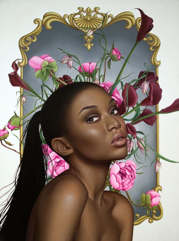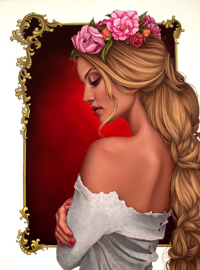 Haven Gallery is pleased to present a collection of oil paintings by Amy Minchew for her second mini solo show at the gallery. Amy’s paintings fuse the beauty of flora with the female form. A notable aspect of this new collection harks back to historical motifs such as art nouveau framework. Intricate and stylized borders can be seen intermingling with her quintessential, highly detailed flora, as they harmonize and serve as a framing device for her female sitters. Much of Amy’s work is inspired by her dreams as she states, “My dreams are to blame for the most vivid, dark, sad and terrifying moments of my life and they, more than anything, fuel the inspiration behind my work. I like to think of my work as capturing moments that we initially see as irrelevant, but have a profound impact on us when our memories take us back to them.”