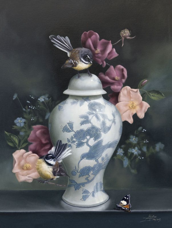 We have always been surrounded by a menagerie of pets who have given me inspiration over the years. When we moved to New Zealand in 2003, I brought with me some pieces of china I had inherited from my mother. I was feeling a bit homesick and decided to paint some of these cups and teapots. I found the process quite therapeutic but missed the “life” in my painting. So gradually the birds and animals from my new environment started to appear in my work as well. It was a turning point for me as it gave me a personal story to tell which, hopefully, a viewer can also respond to.