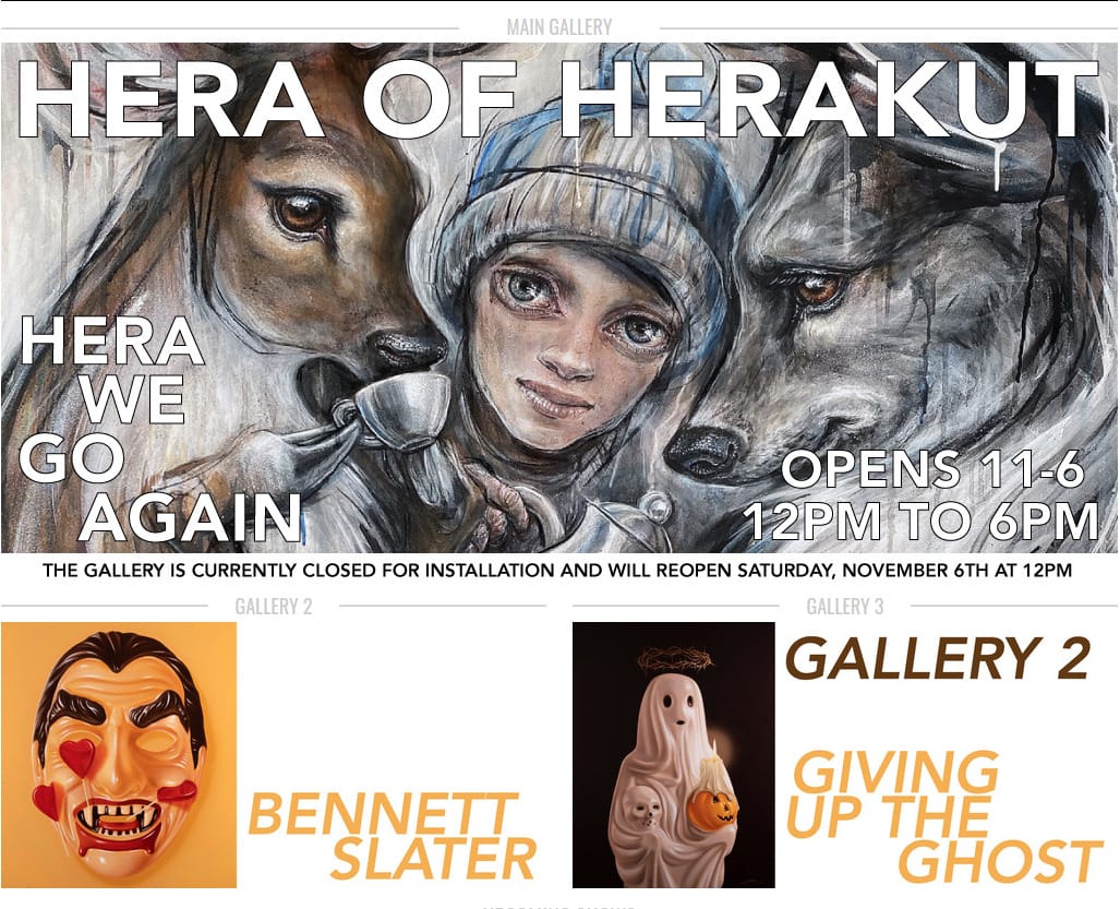 If you enjoy art which revels in that playful space of juxtaposition, look no further than Corey Helford’s opening reception this Saturday, November 6. Celebrating two solo exhibition openings, Corey Helford Gallery will be giving their first peek at Hera of HERAKUT’s new works alongside the paintings of Bennett Slater.
