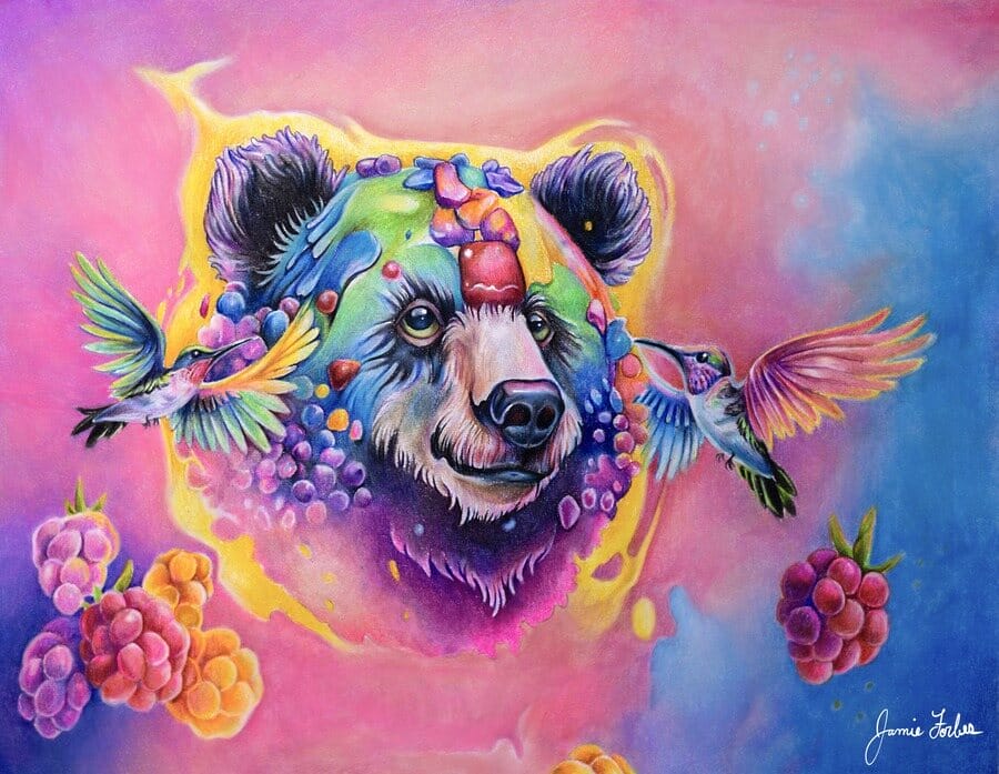 Jamie Forbes, an extraordinary American artist, possesses a remarkable talent for transforming drawing into an alchemical journey of fascination. Nestled in the artistic enclave of North Carolina, Jamie masterfully crafts captivating artworks, infusing surrealist elements with the essence of animals. While predominantly employing colour pencils, her creative repertoire extends to include gouache, sculpture, and even woodwork. Each piece she conjures emerges from the rich tapestry of the natural world, pulsating with vibrancy and meticulously crafted detail. Behold, as her creations drip with a prismatic presence, casting a spell of enchantment upon the viewer. Within Jamie Forbes’ gallery, one encounters a bejewelled bear, an android elephant, and pastel unicorns, all brought to life from the depths of her wondrous dreamscapes.