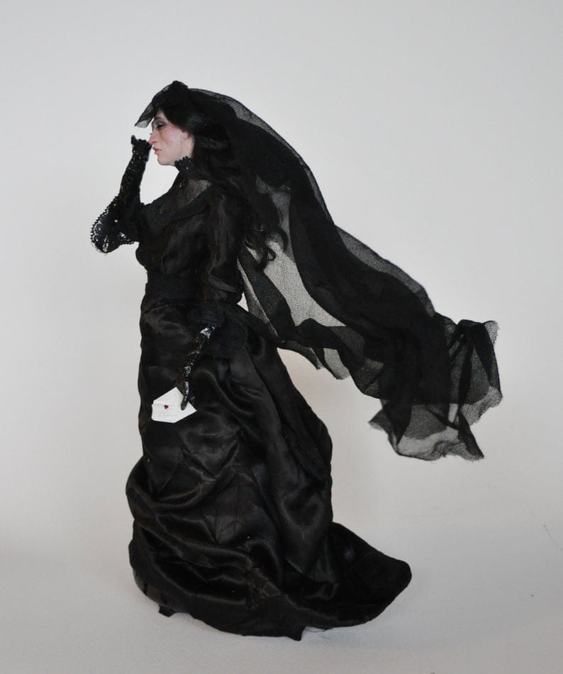 I usually gather the bases or shadowboxes before starting work so I can get the scale right. I build armatures with wire and aluminum foil, and usually a base sculpt with epoxy clay for strength. Then I start adding detail with polymer clay, cure the clay in a convection oven, paint the figure, add hair and costuming, and build the background elements with a variety of different materials. I try to use as much found, thrift or antique materials as I can to add depth and texture. A piece can take anywhere from a week to a few months, especially if it’s in a series as I will often work on several pieces at a time.