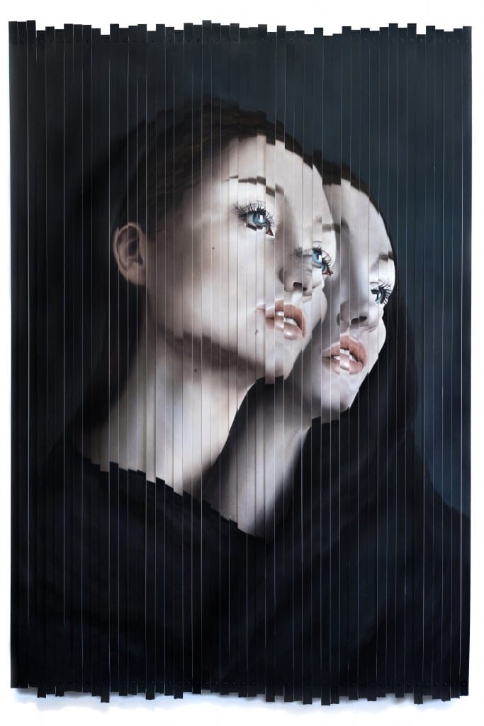 My painting “Gemini” is part of a body of work I’ve been exploring that consists of cutting up the fully rendered paintings into strips, to look as though they have gone through a shredder. It serves as a visual commentary on the destructive nature of man, and disposable nature of society. Not only does this technique add visual and dimensional interest, but also I hope to elevate emotion when viewing these works with an empathetic response. So many people ask why I would cut up my paintings and are instantly met with tension/anxiety/uncertainty when viewing them, but fail to feel these emotions when we tear one another down in reality. We value the objects based on reality more than reality itself. It has become object over man. Or woman into object. This is a huge problem in and of itself, but what’s more critical is that we are also living in a world where everything is disposable. So what happens when people are valued less than the objects that we are so ready to discard? What does this say about how we value one another?
