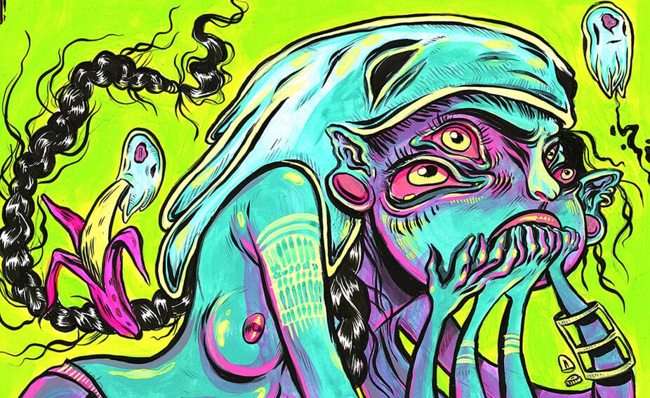 There is nothing subtle about Lauren YS, and anyone who wanders into her surreal world are bombarded by dripping monsters, deformed tentacles and eyes popping out of heads in punchy over the top colors.  She tapers the vulgarity of the imagery with an illustrative style, which makes the work feel more absurd than crude, almost naughty.  Her art is largely inspired her experiences on campus at Stanford (well, that’s my guess anyway, she never said that) where she graduated in 2011 before beginning work with Juxtapoz Magazine and taking a residency at Rabbit Eye Movement in Vienna.  She is as well known of her drawings as her paintings, and made headlines in December with high critical praise for her murals at Miami’s Wynwood District as part of the 2014 Art Basel festivities.