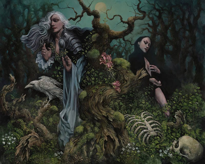 Haven Gallery is pleased to present Craww for his second solo show at the gallery entitled, “Woven. “Woven” will consist of nine oil paintings that metaphorically chronicle the passage of life and time for all living things. Poetically painted passages and interconnectedness grace each composition as the artists quintessential females dance and twist à la the Mannerism period, fluidly amalgamating with their environments. An acceptance of the phases of life, spaces we fill and leave, and relationships we create, are highlighted in Craww’s inclusion of the natural world as well as imagery of death and relic. Time in all forms is nodded to as a motif to connect us to the past, present and future, and serve as a reminder of the interconnectedness of all living things, even after passing.