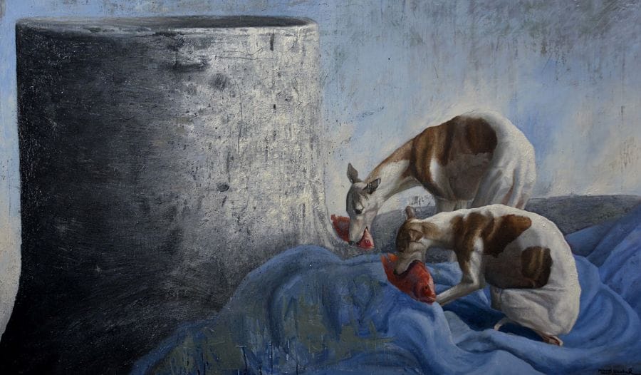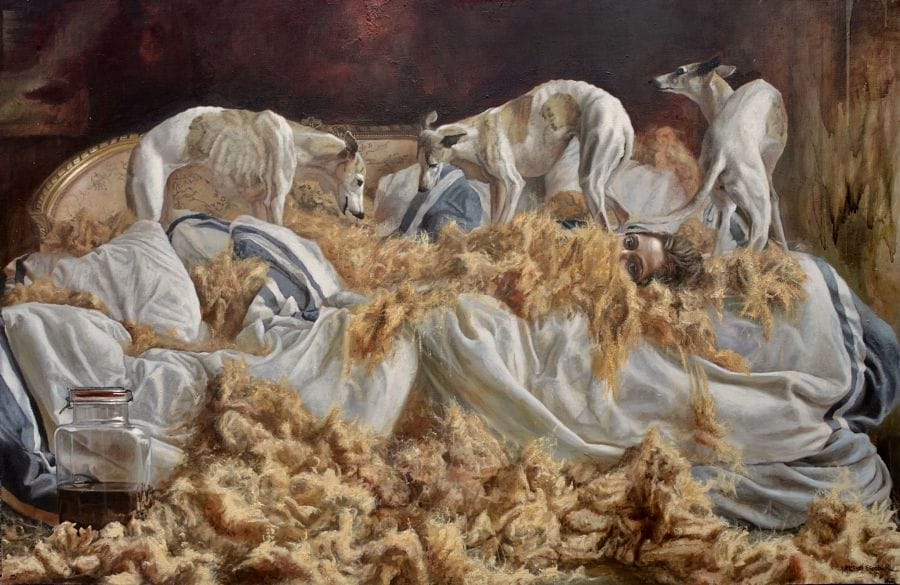 The appearance of Greyhounds has been widely used in art throughout history, for example Tiepolo or Brugel. But the Greyhound isn’t used as the protagonist of the work. Animals, in general, and how they are mixed in scenes they would never be, like with hundreds of petals, jars with water and gas masks like encapsulating the war, sheep wool, insects or a death goose.