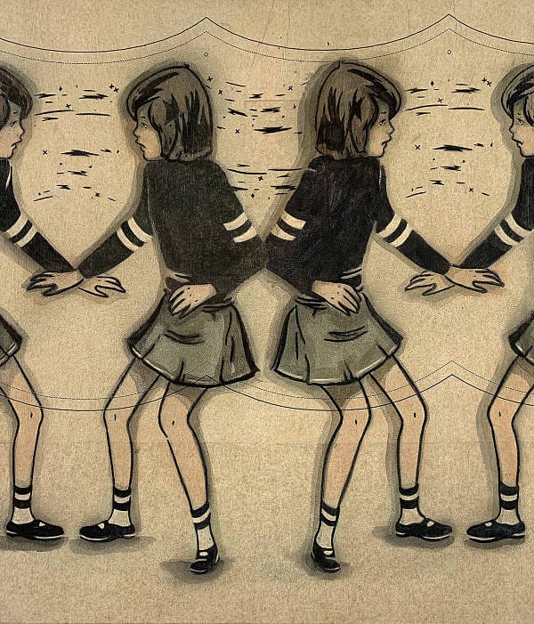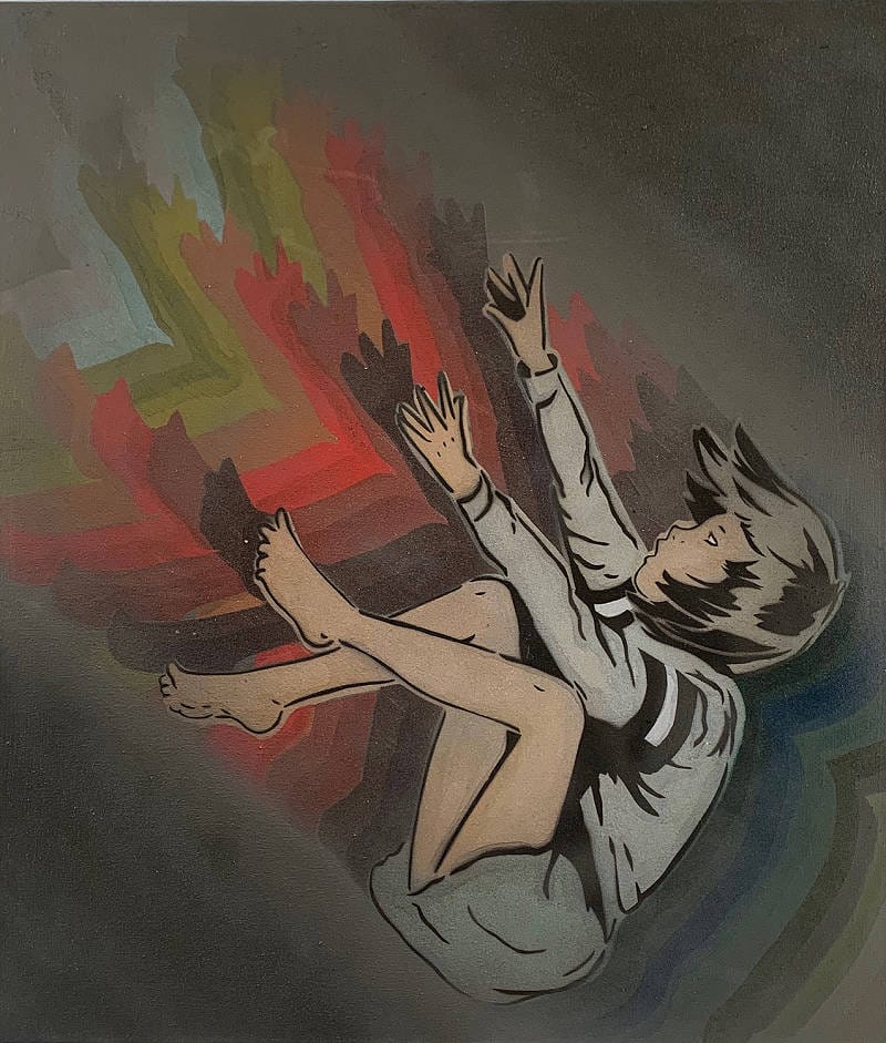Bringing a contemporary edge to the innate elements of nostalgia, Mando works primarily with spray paint, stencils, and collage elements. She incorporates these elements of street art juxtaposed with the familiarity of the picture book inspired world to create work that is both edgyand comforting. Her paintings frequently feature repetitive and mirrored imagery, eliciting a dream-like quality that is simultaneously pleasing and haunting.