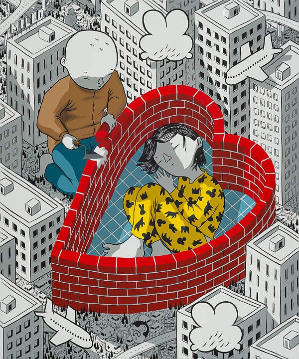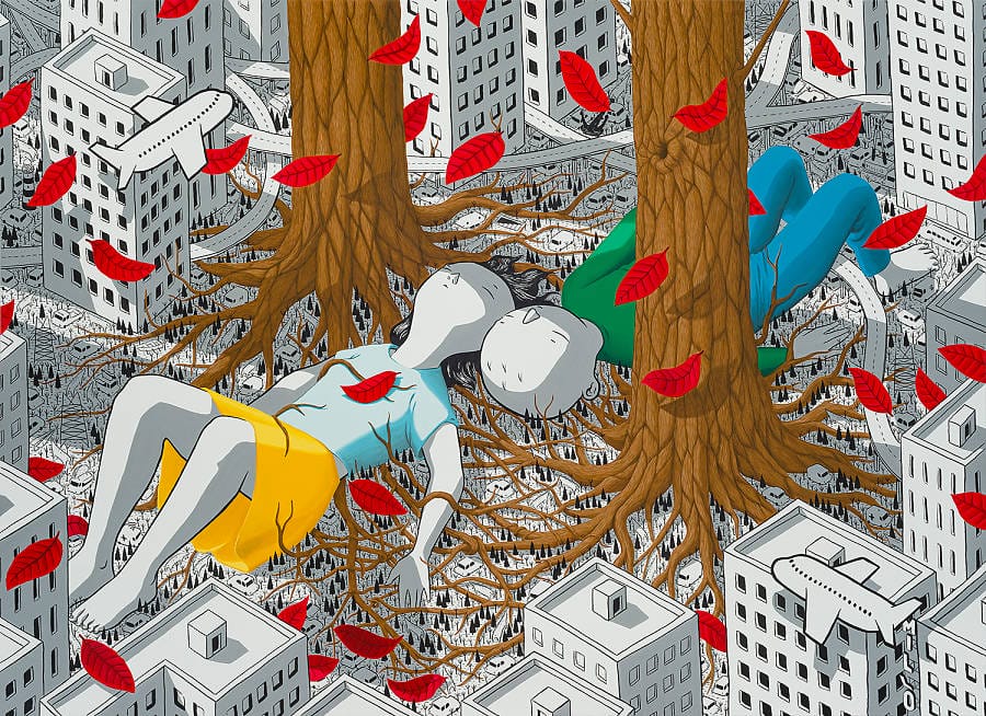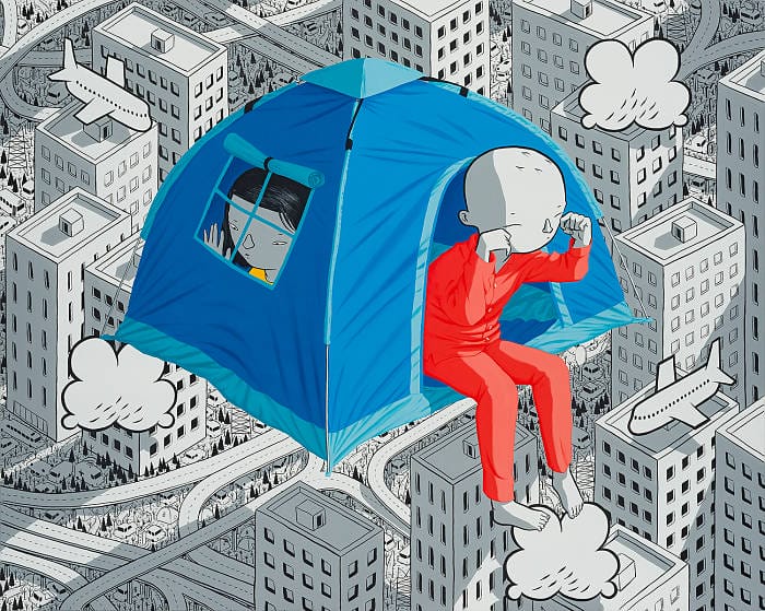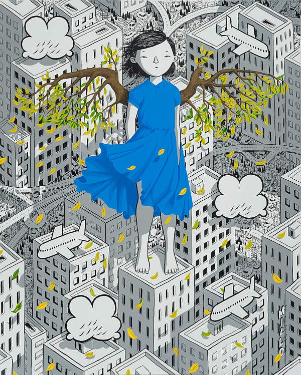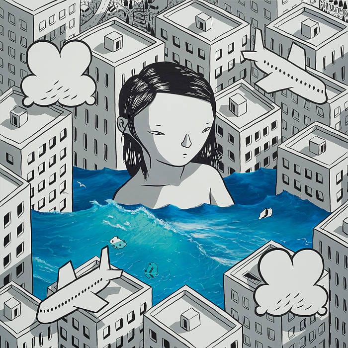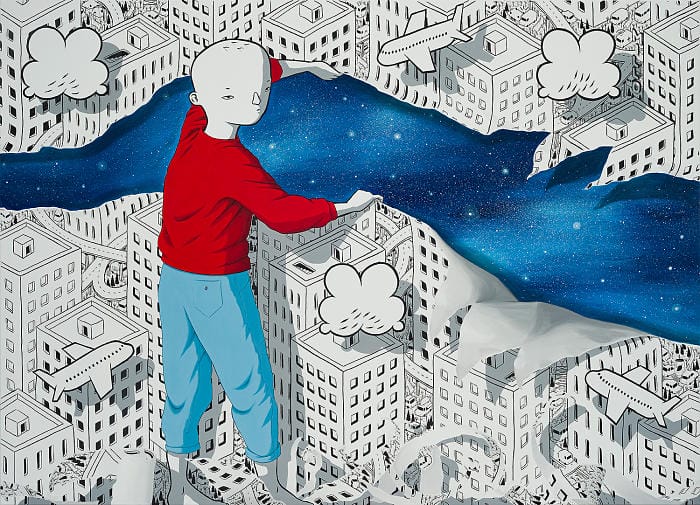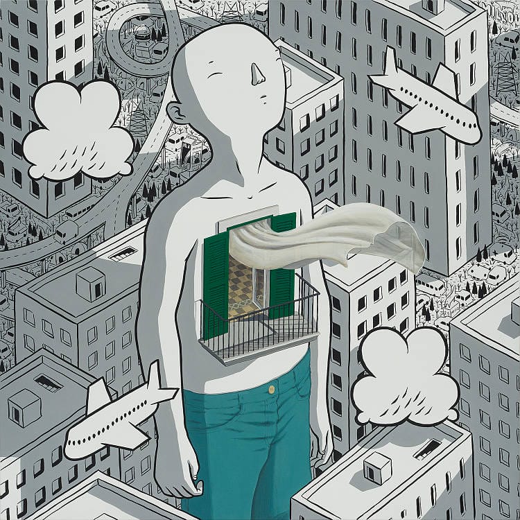 The circumstances of this past year have played a huge part in the creation of this show. The initial shock of being scared and stuck gave Millo time to reconnect with his own imagination, and focus on what people globally were simultaneously doing: dreaming. This exhibition, from internationally renowned muralist Millo, is a collection of works in his signature predominantly black and white style. With detailed monochrome cityscapes and color pops to highlight the subjects, Millo creates the moment just before waking in a series of breathtaking scenes. The friendly inhabitants of each scene float above their urban settings displaying a blend of dream and reality. He crafts giant characters who are out of scale and often clumsy, confined to an urban habitat that forces them to invent new ways to live.