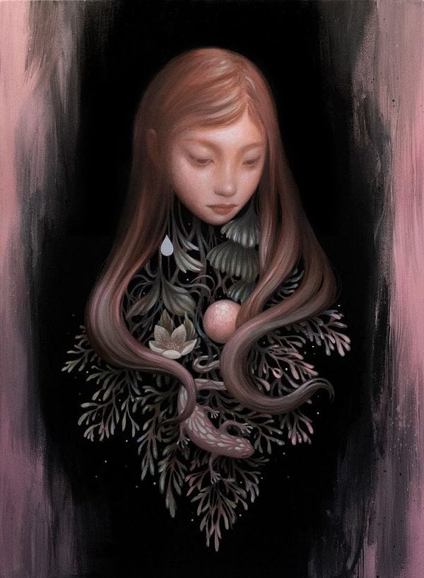 Sol’s graphic and illustrative inspirations are drawn from enduring collective influences. Everything from animation to decorative design makes an appearance in her esoterically stylized worlds. Influenced by Japanese manga and the whimsy of Ghibli films, as well as the idyllic natural worlds of classic-era Disney and the Golden Age of turn-of-the-century American Illustration, Sol Incorporates references to varied cultural and folkloric embodiments of the feminine. Her works often feature a female protagonist in collusion with supporting animal or creature characters, a tradition of friendship long spun in popular culture from animé to Bambi.