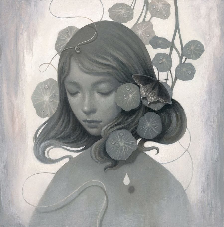 Technically self-taught, Sol has spent many years perfecting her own mixed pigments and materials. Known for a distinctive palette with a subtle ghostly cast, she has in recent years experimented with more intense contrasts and darker hues. Her use of color often recalls late 19th and early 20th-century illustration, art nouveau design, and even the Celadon vases she remembers from her childhood. The diffuse effect of her pigments, however, tends to feel generally nostalgic rather than specifically referential, as though drawn from a distant and strangely non-existent past. Her technique is labor intensive, involving the application of several layers of acrylic washes to achieve the translucence and opacity of her surfaces. She is also using oils and exploring sculpture in her latest bodies of work. Preferring wood panel to canvas for its unique material qualities, Sol often allows the organic nature of the substrate to dictate the direction of her compositions.