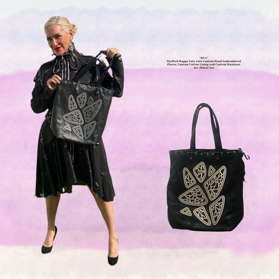 First, I would show the participating artists the bag choices then ask for a mock up for approval based on the bag. The artists were free to create what they wanted as long as it was a 1/1 and for the capsule only. All artist’s were paid to create something unique and some had never painted on handbags before so that was super exciting for us all! Hideki truly to a bag takeover. He hand embroidered custom pieces of metal to the front of the thrifted bag, added his own custom lining and also turned the tote onto a drawstring pouch. Hideki is based in Paris so that was fun always being cognizant of the time difference. He is very comfortable with custom work as he is a fashion designer and he is a fearless one at that. His creations are architectural dreams. Hideki and I are talking about creating some wearable pieces for me as we work together very well. Sometimes we even speak via sketches!