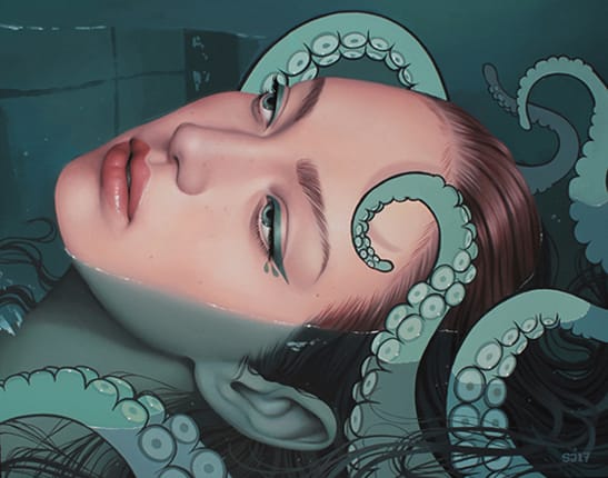 I love nature, as many people do. I watch nature and science documentaries all the time while I’m painting and I’m sure it influences me slightly. When I lived in a less urban environment growing up, I always found great inspiration from going on nature walks by myself, soaking in the landscape. It felt like I was escaping into another world, and in a time where human development has often overtaken those landscapes, it’s makes it feel more important. I really enjoy the idea of people evolving from more ancient species and places as well, and that somehow the symbolic imagery of them, ghostly appearing throughout my work, appeals to that connection. That it’s still a part of us and calls us, no matter the manufactured world we create.