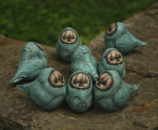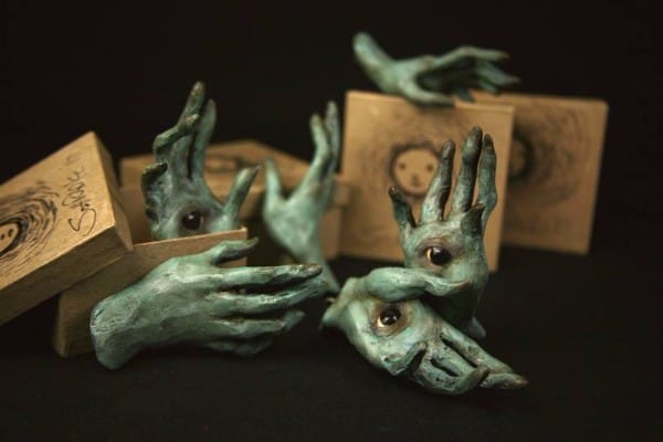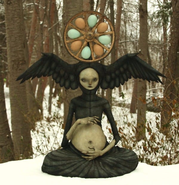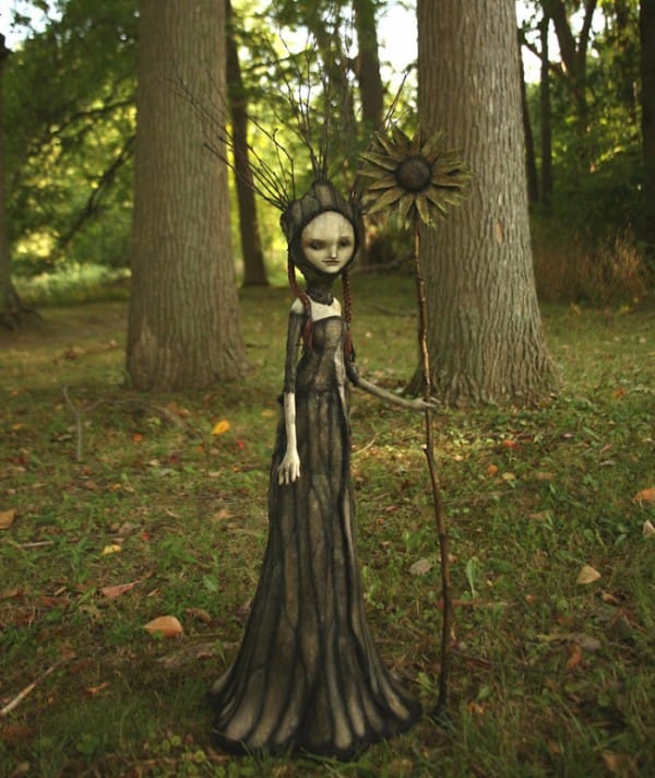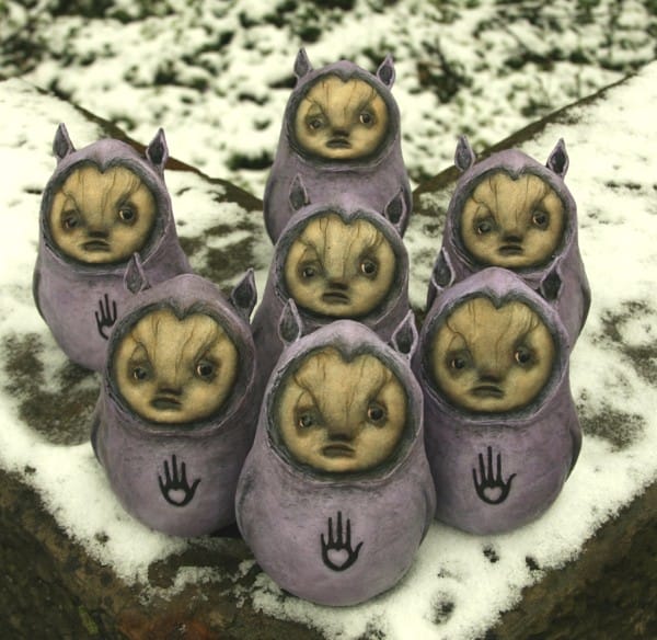 There is a powerful force at work behind the sculptural pieces of artist Scott Radke. Through dark hollows and isolated forest clearings, his characters emerge all gnarly fingered and looking like malignant creatures, but not the kind you are afraid of, ones that you are immediately drawn to. You want to know of their mysteries and you can sense a force that seems to provide a feeling of comfort, an intensity that emits from their faces and the familiar symbols that are presented and embedded into their bodies. It’s always incredible to me how artists can produce these forest dwellers. Where in their imagination did they bring forth these characters? From deep in our subconscious, we connect to their familiar faces that are tremendously moving and filled with insight… willing to share part of the darkness through their voiceless presence.