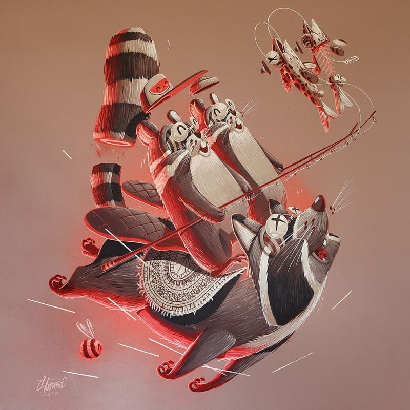 Cultivating a delirious and humorous universe nourished by the euphoric energy of cartoons, STOM500 is a self-taught virtuoso from a small village in the Swiss municipality of Basel. Trained as a graphic designer, professional illustrator and a renowned graffiti artist for over the past five years, STOM500 has been, as he defines himself with humor, a veritable “Swiss army knife”. Spray, brushes, acrylic … Large murals or small canvases: he uses a variety of mediums and styles with a predilection for animal themes which, under the varnish of pleasure, carry a relevant message, often humanistic or ecological. Like his swirling bees or his seemingly incompatible bestiaries, such as the raven and the fox inspired by La Fontaine’s fables.