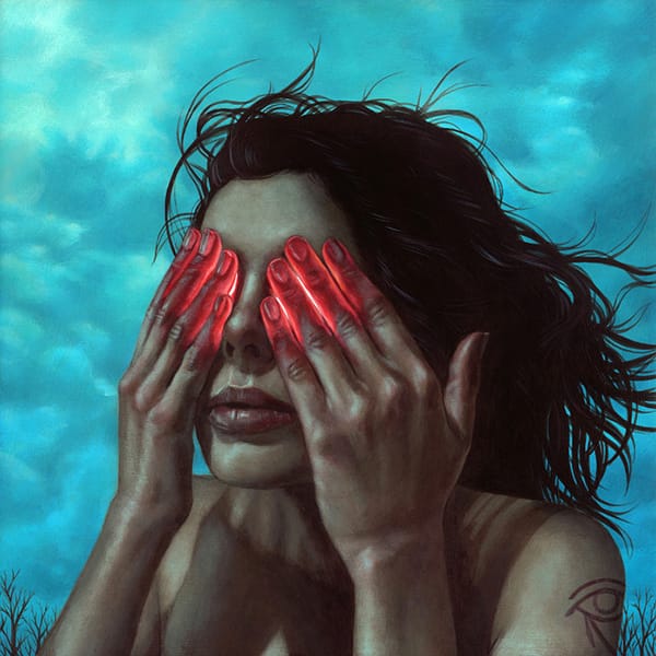Feelings of nostalgia and longing bubble to the surface when viewing one of Weldon’s paintings. Regardless of theme, his use of color and light become magnetic for any viewer, drawing you in, making you question the whats and whys of his specific visual stories. Using the vessels of cats and young women over others, his work can act as a highly successful and popular means to communicate the symbiotic experience of loving and fearing something at once. Cats with four eyes looking scary but also so incredibly cute; attractive young women staring out into space with neon firework spitting out of their eye sockets—these images can represent so much and so little depending on who’s viewing them. These images are strikingly beautiful, full of vibrant longing and inquisitive attraction that one feels looking at the Northern Lights or a Pink Floyd laser light show.