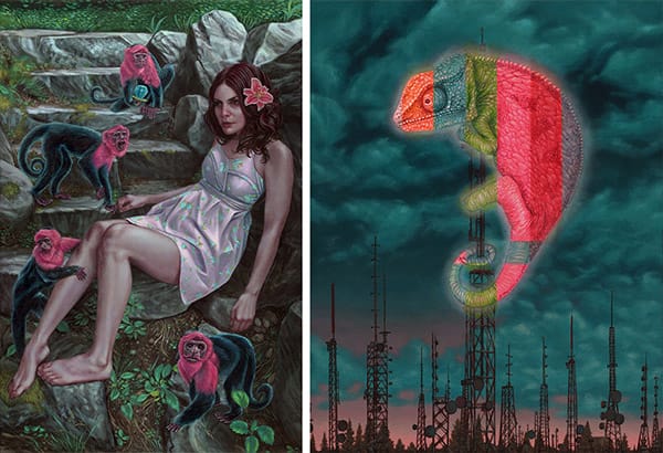 His attention to detail and expression in all his characters, feline or otherwise, is exquisite and evoke a range of emotions and narrative experiences, from alternative histories, quiet alien cat provenance, pop culture infusion into life forms, and even strange Alice-in-Wonderland-themed psychedelic evolutions. His dreamlike situations focus on the human interaction with the natural world, whether the human is the voyeur or the focus in the work, his ability to engage the emotive and evocative human experience is fascinating and inspiring, while his artwork is simply visually enthralling.