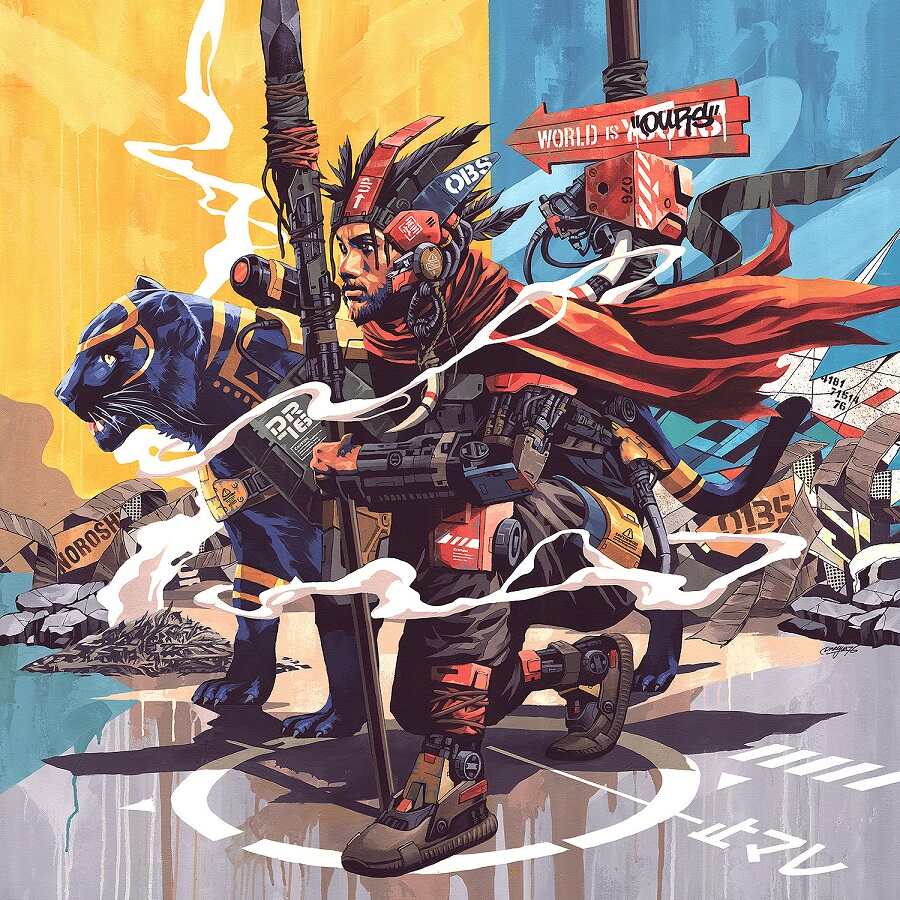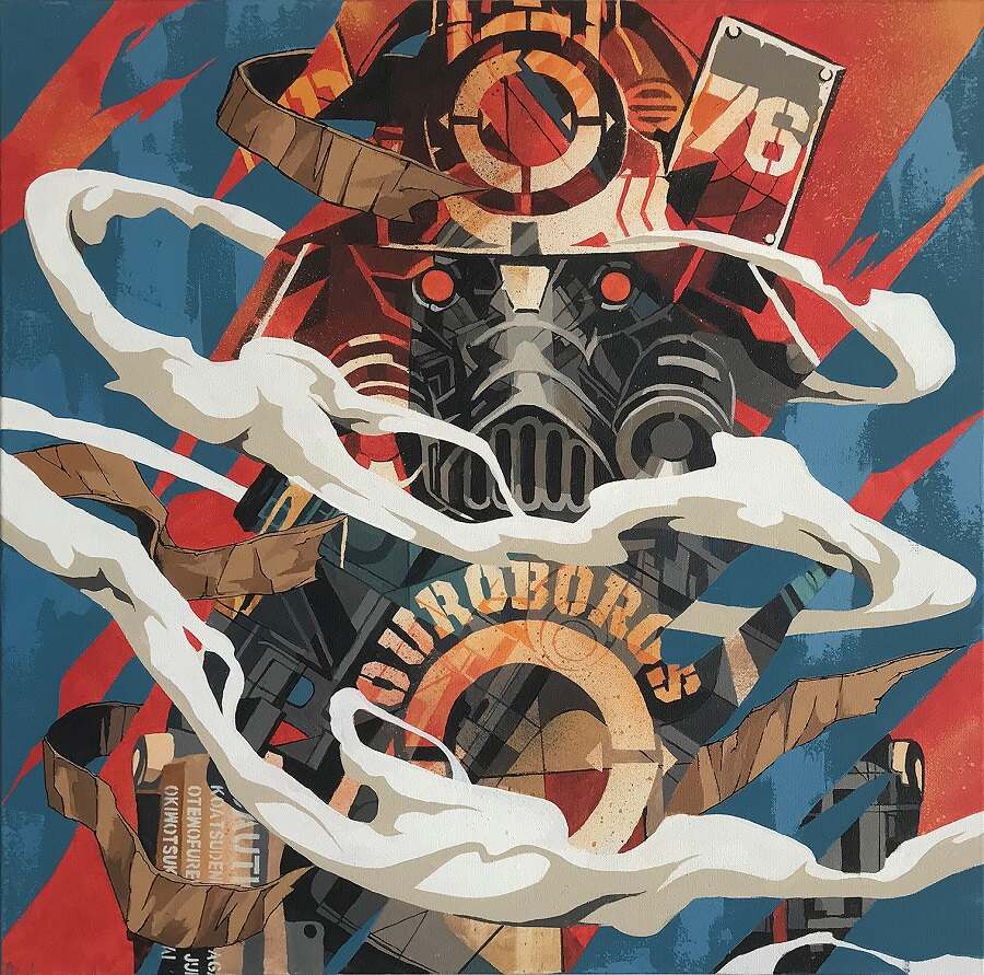 His intricate and complex style is rooted in a combination of Graffiti, Manga and Ukiyo-e. The landscapes and figures are defined by black shadows, mimicking traditional block printing, and are superimposed upon textured layers of vibrant colour, creating a striking effect. His work connects to the soul of the viewer with a touch that is passionate and full of vitality, rooted in his street art past. Like all of the featured artists, DRAGON76’s style is constantly evolving, producing work that focus on the coexistence of conflicting things, such as past and future, stillness and movement, justice and evil, and this show is no exception.