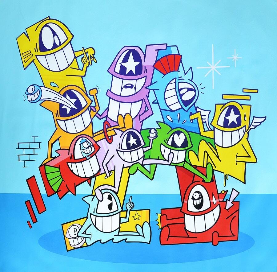 “In the beginning my style was very basic, always characterized by the “smiling fish” character. In recent years it has evolved in such a way that I’ve created my own universe through different compositions that are currently very geometric. I’ve added a lot of color and balance to the compositions so that the character isn’t so isolated. I’ve searched a little more for the presence of characters from a universe that’s very influenced by graffiti and pop-art. So far the idea is always to evolve the style and change while taking from what I’ve been doing in recent years, but always trying to find a solid scheme in which the characters are sustained in a world of color and joy.”
