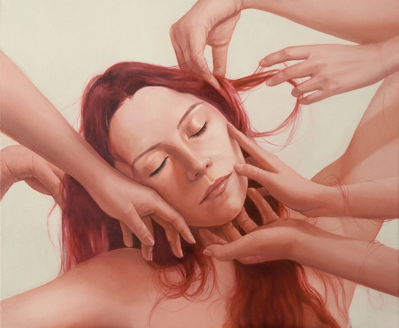So, yes, being the “main actress” in the scenes I create is deeply tied to the self-exploration aspect of my work. But there are also practical benefits to painting the same face repeatedly. Over time, I’ve become so familiar with my own features that I can reconstruct them from memory, which makes the process more efficient. This repetition also gives my work a sense of cohesion, much like in classical or Renaissance art—think of Perugino, Botticelli, or Parmigianino, where the faces often bear a striking resemblance to one another.