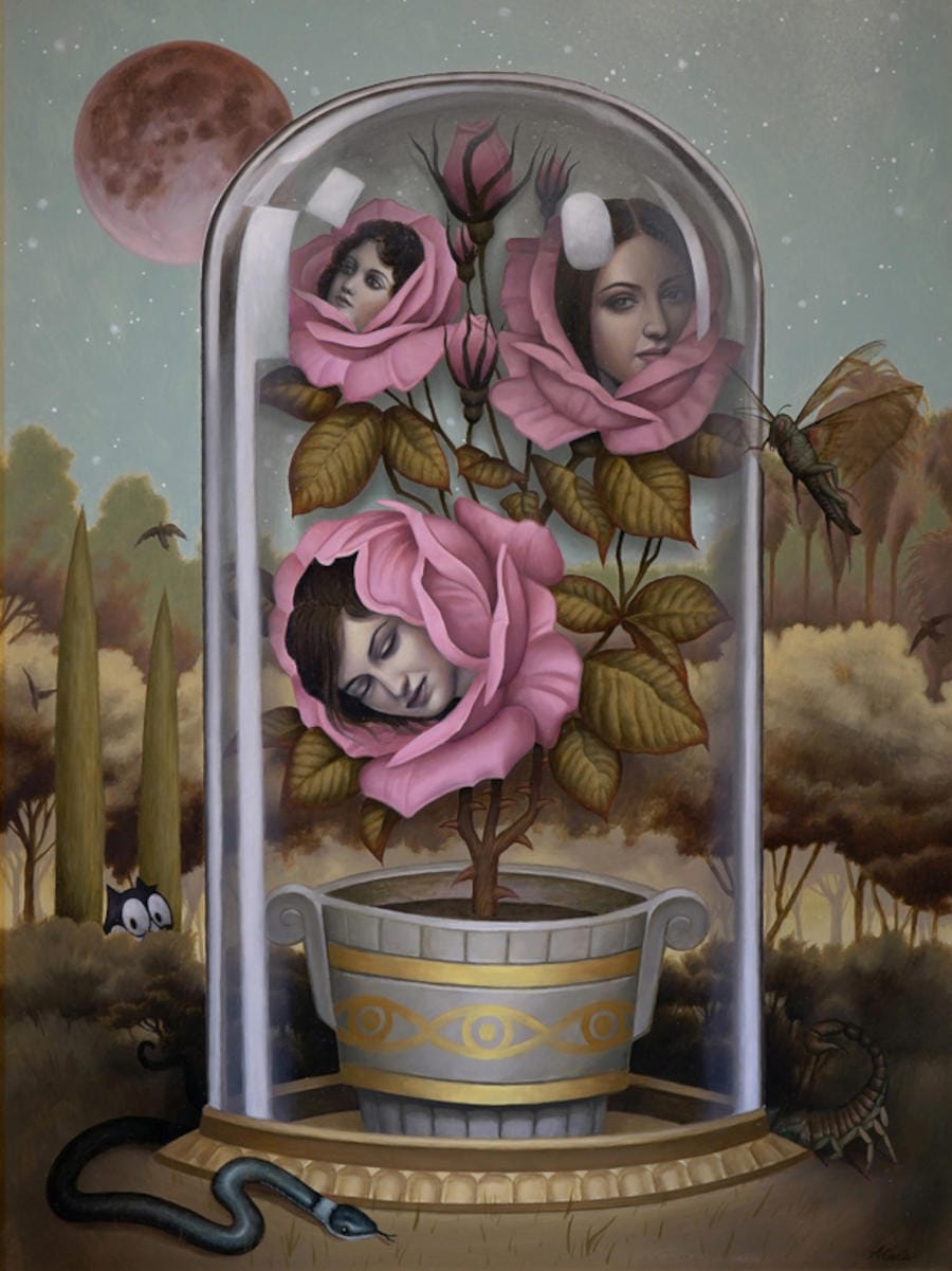 Alex Garcia’s exhibition Amore Muerte (Love Death) shares a new body of work which continues to strengthen his new direction as an artist. While his earlier works leaned more into darker imagery, Alex has spent the past few years exploring more positive themes and motifs. Amore Muerte still has an echo of his earlier style while focusing more on happier stories that he hopes the viewer will connect with. Each painting holds its own narrative, a tale to be discovered, a journey started by Alex and which waits to be completed by each individual viewer.