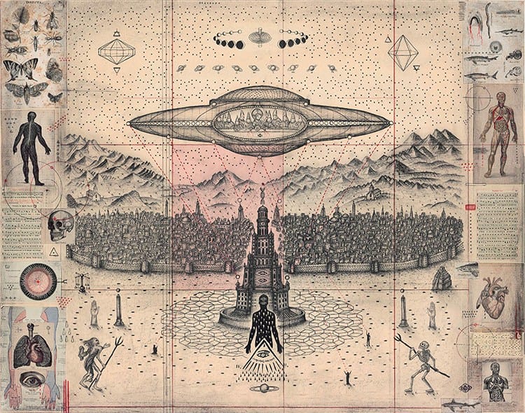 Paradise Lost is Daniel Martin Diaz’s visual interpretation inspired by John Milton’s epic poem. This new series is comprised of ten drawings which allegorically illustrate the “Fall of Man” and “War in Heaven” during contemporary times. Diaz derives his “Old World” style and mystical imagery from a variety of sources—including Byzantine iconography, retablos, ex-votos, the Illuminati, ephemera, alchemy, scientific diagrams, and 16th-century anatomical engravings.